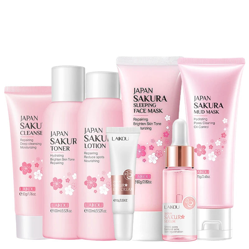 9-piece set includes: Sakura Facial Cleanser 50g, Sakura Toner 100ml, Sakura Lotion 100ml, Sakura Essence 17ml, Sakura Eye Cream 15g, Sakura Sleeping Mask 80g