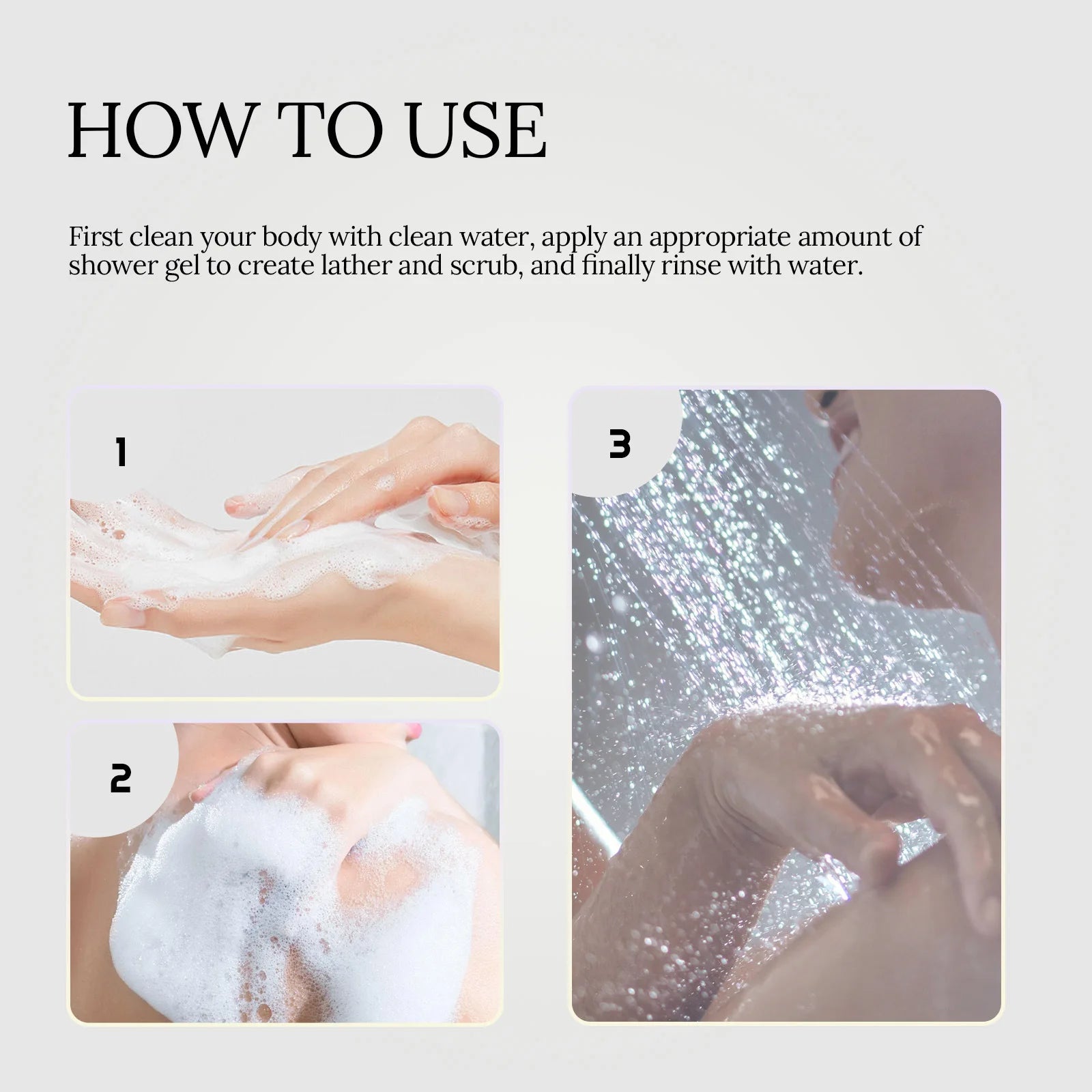 First clean your body with clean water, apply an appropriate amount of shower gel to create lather and scrub, and finally rinse with water.