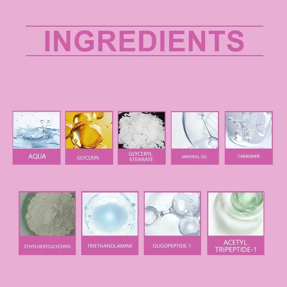 AQUA、GLYCERIN、MINERAL OIL、GLYCERYL STEARATE、ETHYLHEXYLGLYCERIN、CARBOMER、TRIETHANOLAMINE、OLIGOPEPTIDE-1、ACETYL TRIPEPTIDE-1