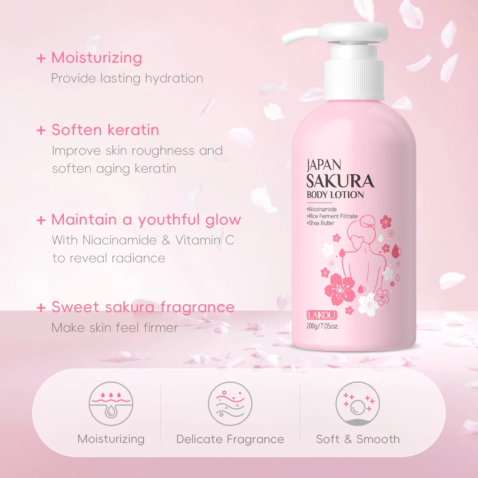 LAIKOU Japan Sakura Body Lotion – 200g / 120g / 80g Moisturizing & Whitening Cream with Niacinamide & Sake Extract