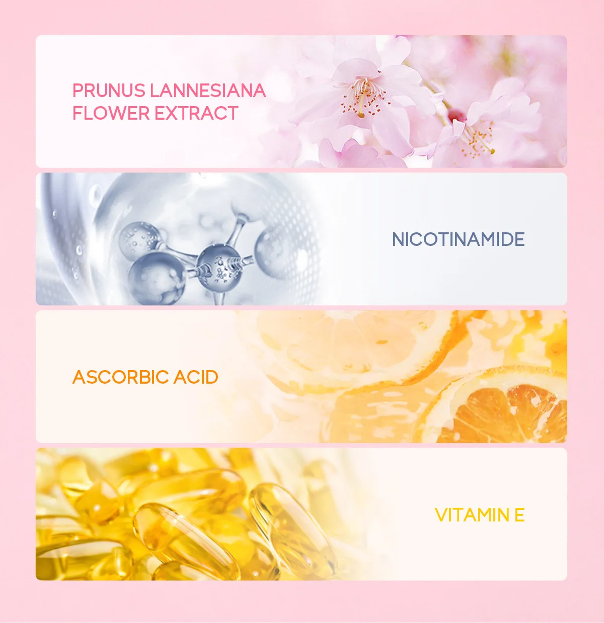 1.Containing Prunus Lannesiana Flower Extract, Niacinamide, Vitamin C and Vitamin E