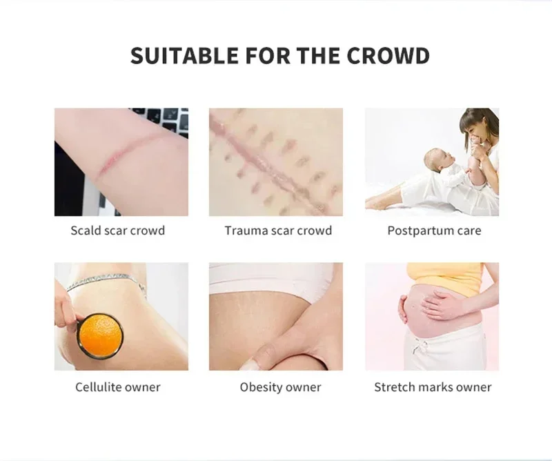 Functional indications: Promoting blood circulation and removing scars. It is used for theauxiliary treatment of hypertrophic scars caused by burns, scalds, carbuncle, trauma, etc.lt can also be used for stretch marks, obesity marks and growth marks.
