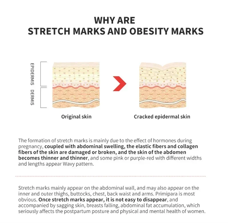 The formation of stretch marks is mainly due to the hormonal effect during pregnancy, coupled with the swelling of the abdomen, the elastic and collagen fibers of the skin are destroyed or broken, and the skin of the abdomen becomes thinner and thinner.