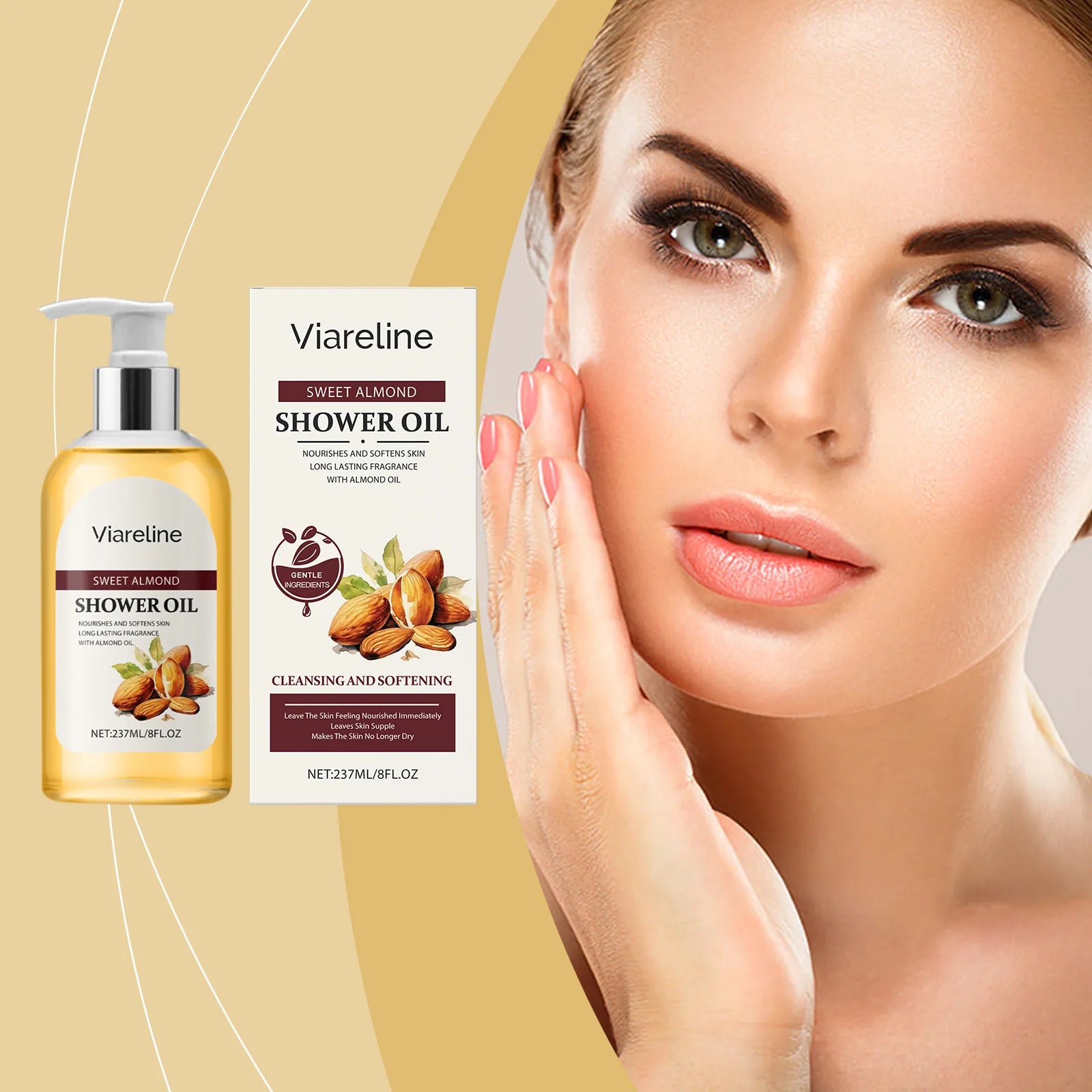 Viareline's Sweet Almond Shower Oil redefines shower essentials with its innovative oil-to-milk formula that: